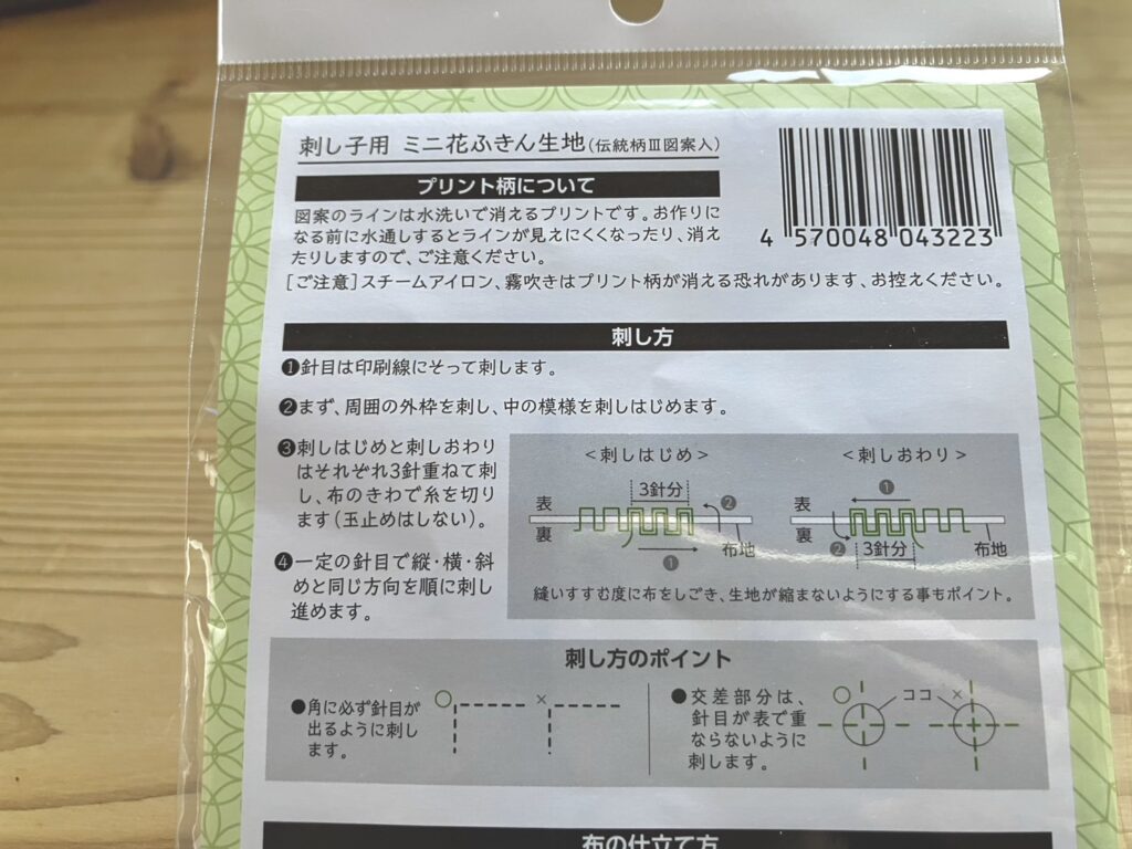 図案が印刷された晒(さらし)と、説明書が入っています。
